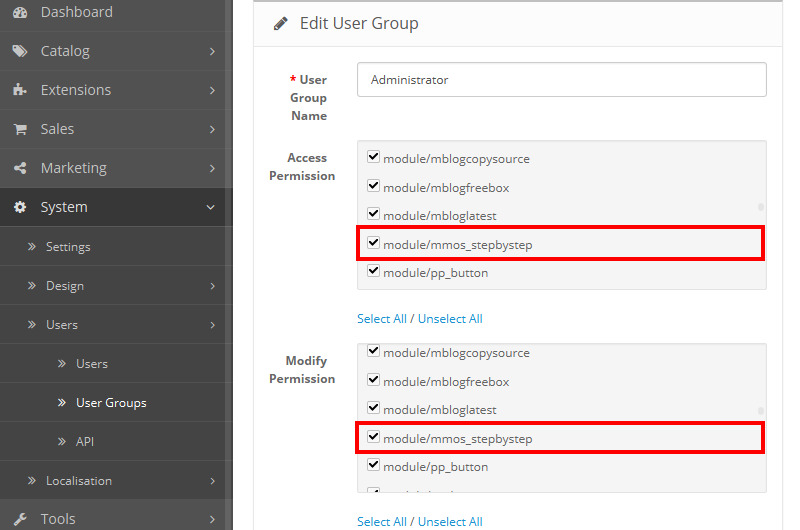 Login to your Opencart admin and go to System ➔ Users ➔ User Group.