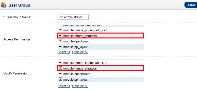 Check both Access permission, Modify permission for Ultra Product Tabs as image 2.2.