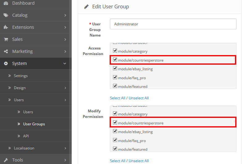 Login to your Opencart admin and go to System ➔ Users ➔ User Group.