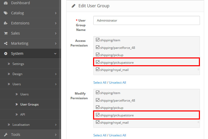 Login to your Opencart admin and go to System ➔ Users ➔ User Group.