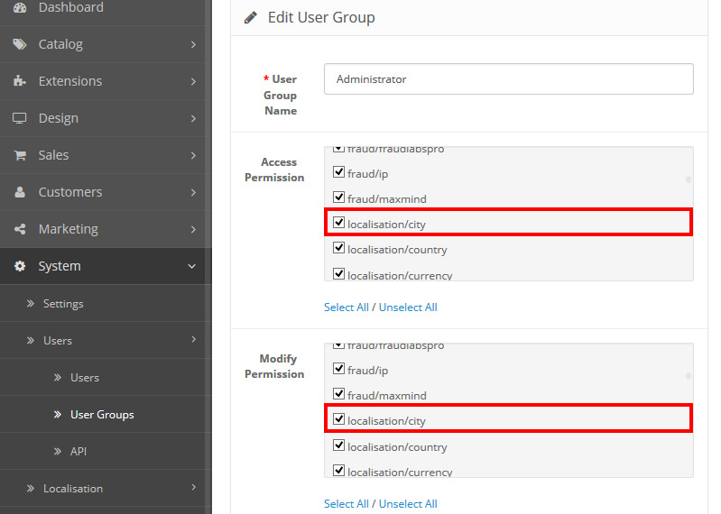 Login to your Opencart admin and go to System ➔ Users ➔ User Group.